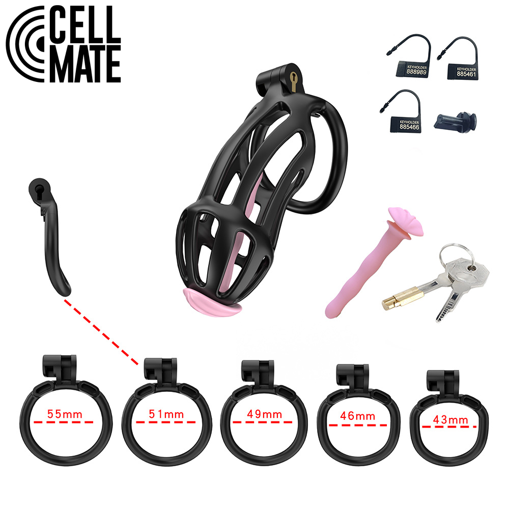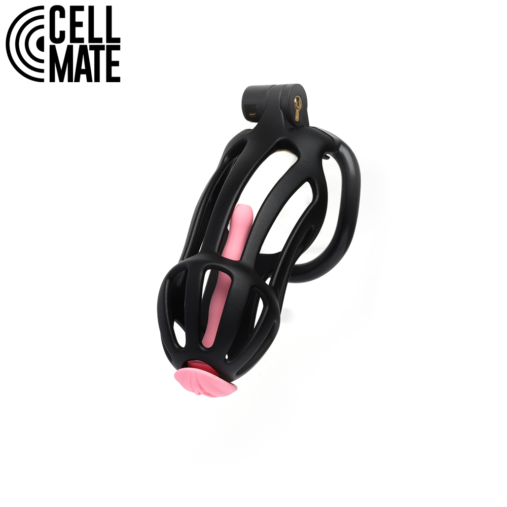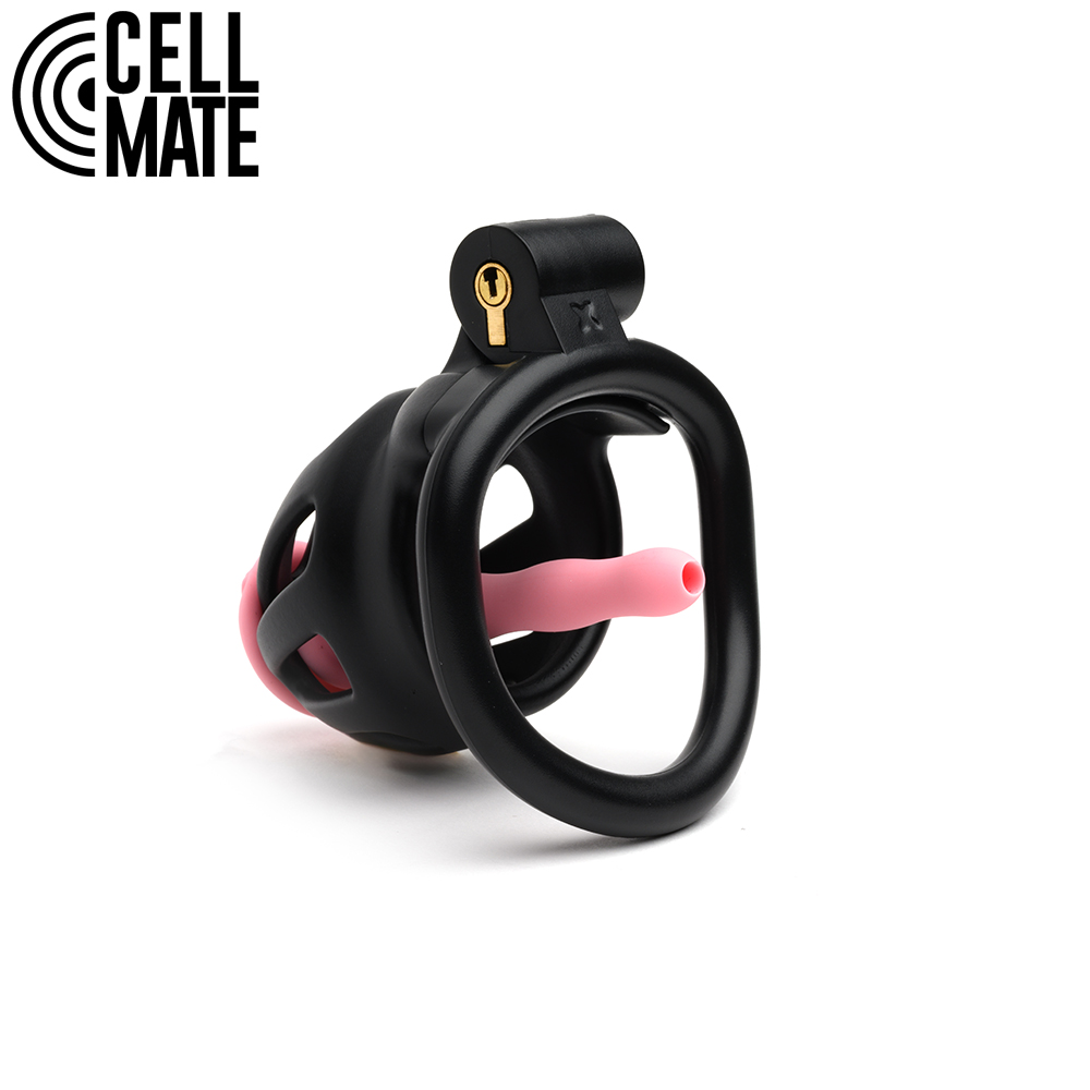 Your CELLMATE Centurion is black and has a pink, pussyficating silicone catheter. This flexible, sounding plug has a tiny pink pussy on the front to show your true genitalia and has a passageway for you to piss through while remaining caged.