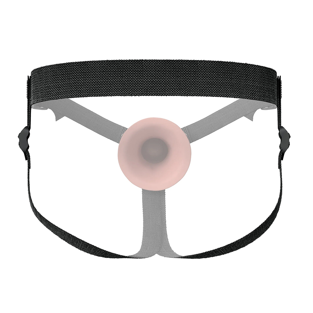 The premium nylon harness is adjustable and smooth to the touch. It is firm enough to hold the dildo securely in place as you move.