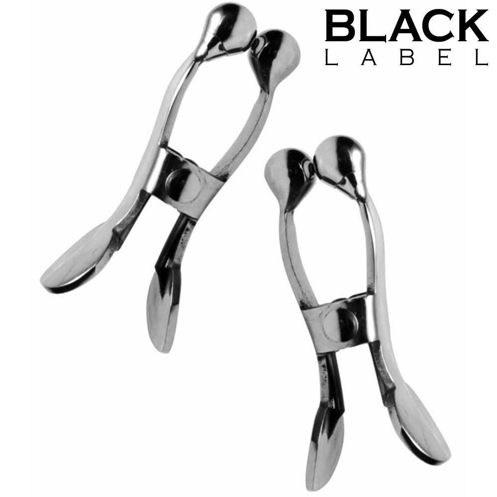 A total legt of 50 mm., and a width of 15 mm. A very small version in its kind. The stainless steel nipple clamps, called Pincher Balls have a sharp edged feeling when applied to your nipples.